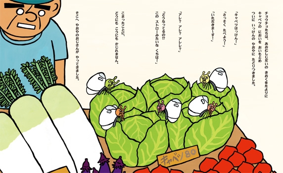 チョウチョってあおむし時代の主食はキャベツなのに、大きくなると花のミツしか吸いません。あんなに毎日食べていたキャベツの味が恋しくないのかなぁ…?と思ったのが、この絵本を描いたきっかけです。